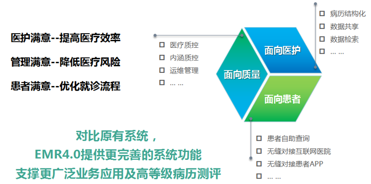 功能更便捷:基于一体化的应用设计,更加符合临床医护的使用思维,支撑广泛业务应用及高等级电子病历测评要求。