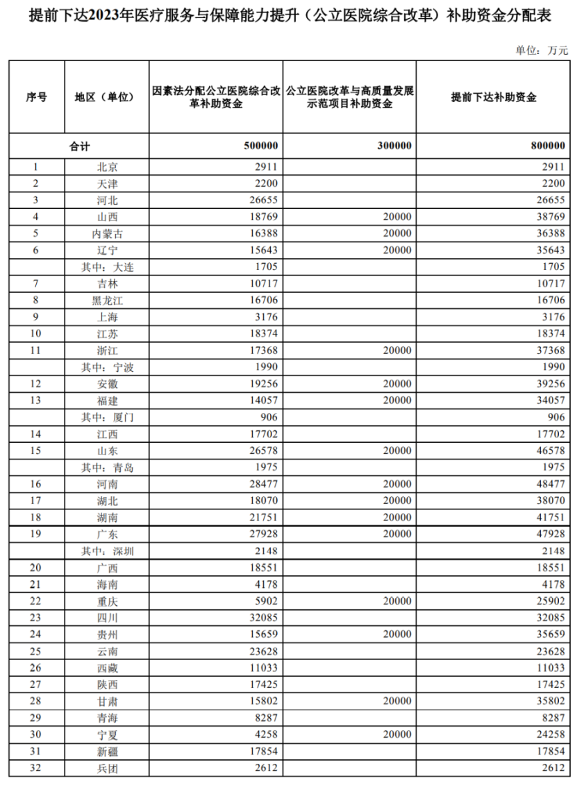 去年12月,财政部发布《财政部国家卫生健康委国家中医药局关于提前下达2023年医疗服务与保障能力提升(公立医院综合改革)补助资金预算的通知》,提前下达2023年医疗服务与保障能力提升(公立医院综合改革)补助资金80亿元,用于推进公立医院综合改革,补助资金与去年基本持平。因素法分配公立医院综合改革补助资金50亿元,公立医院改革与高质量发展示范项目补助资金30亿元。